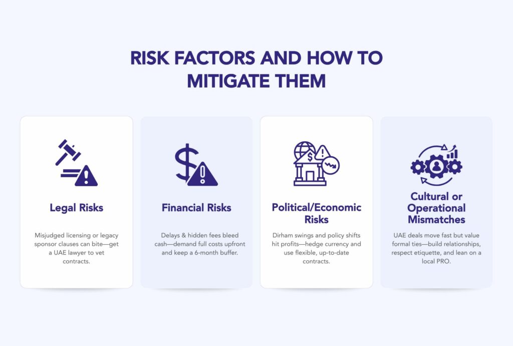 Mitigation tip: Hire a UAE-based legal advisor. Have them review every contract. Avoid “template” deals or off-the-shelf MoAs without customization.